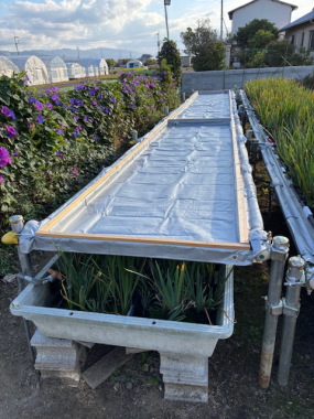 大洲市新谷田合栽培所に続き伊予郡松前町に栽培所を開設いたしました。松前町は水の豊富なところで地下から湧き出る水が川となり栽培所の横を流れ(国近川)気候も穏やかな地で霜も降りない花菖蒲の栽培には適した地です。ここでは川の水を利用した自動給水装置を完備、苗の成長に合わせ水量調整を可能にしました。栽培条件のそろったここ松前町で数々の苗を育ててまいります。