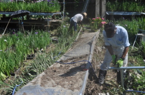 | 園長、毎日草引きと苗の手入れで大忙し・・・一株ごと品種別に並べます。 |
